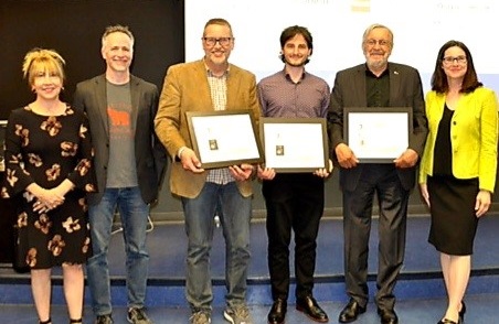 Sophie Montreuil (Directrice générale de l’Acfas), Pierre Chastenay (auteur d’Une visite guidée du système solaire), Thomas Blais-Leblanc (alias Thom, illustrateur d’Une visite guidée du système solaire), Yanick Villedieu (auteur de Le Deuil et la Lumière -Une histoire du sida), Nicole Parent (Directrice générale de Médecins francophones du Canada)