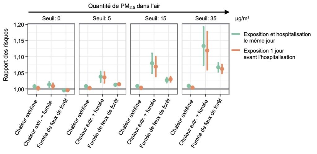 Cet effet synergique entre l’exposition à la chaleur extrême et la fumée des feux de forêt est préoccupant. Puisque l’exposition à 15 µg/m3 de PM2.5 un jour de chaleur extrême est équivalent en ce qui concerne le risque d’hospitalisation à une exposition à 35 µg/m3 de PM2.5 un jour sans chaleur, les agences gouvernementales devront probablement ajuster leurs normes et les rendre plus strictes lors des jours où il y a double exposition.