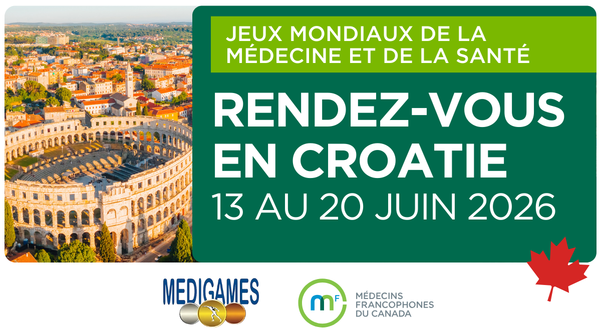 Médecins francophones du Canada est fière d’être partenaire officiel des 45es Jeux mondiaux de la médecine et de la santé qui rassemblent plus de 2000 participants de 40 pays depuis sa création en 1978. Cette année rendez-vous du 13 au 20 juin 2026, à Pula et Medulin, en Croatie.