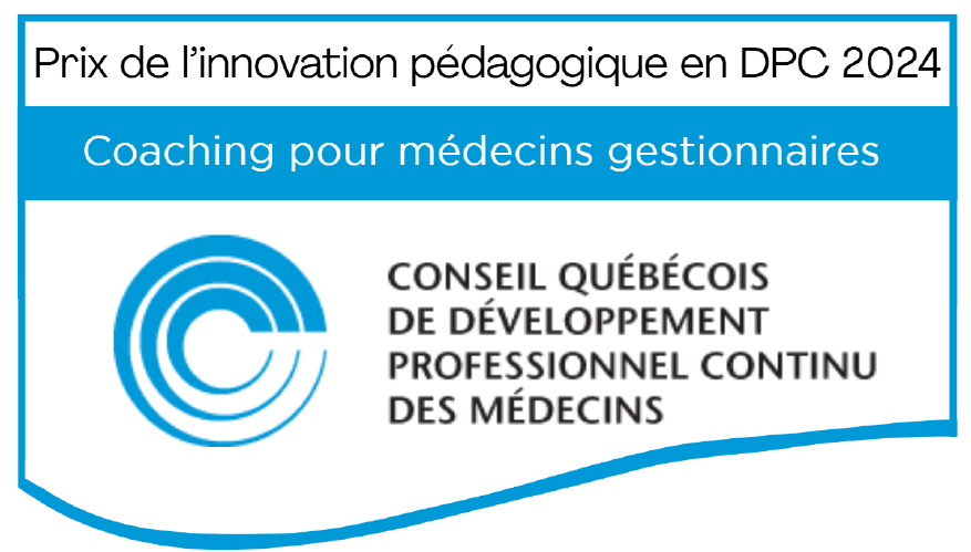 Le programme de Coaching pour médecins gestionnaires a été récompensé en 2024 par le Prix de l’innovation pédagogique en DPC remis par le Conseil québécois de développement professionnel continu des médecins (CQDPCM), mettant en valeur un projet innovateur en DPC ayant pour objectif d’améliorer les pratiques médicales par la formation continue.
