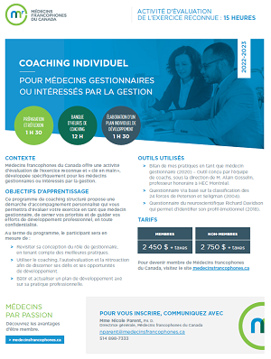 Médecins francophones du Canada offre une activité d’évaluation de l’exercice reconnue et « clé en main », développée spécifiquement pour les médecins gestionnaires ou intéressés par la gestion.