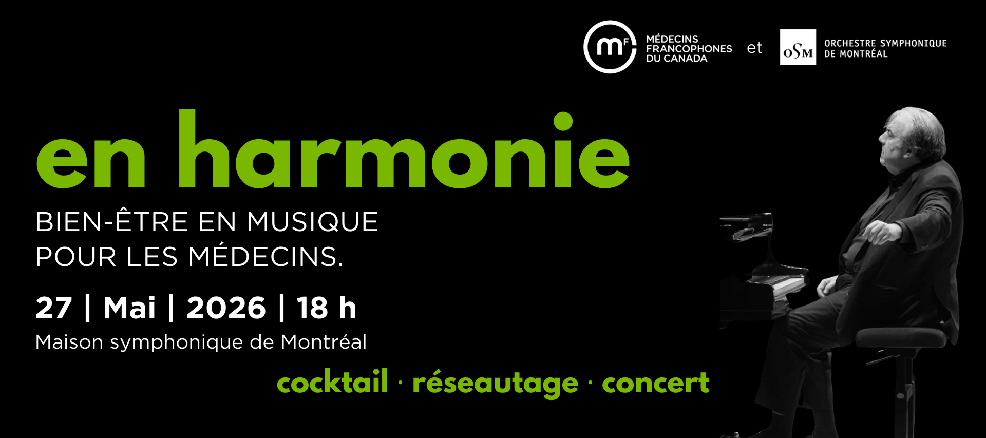 Médecins francophones du Canada est fière de s’associer à l’Orchestre symphonique de Montréal (OSM) pour valoriser les bienfaits de la musique sur la santé. À cette occasion, nous vous convions à une soirée spéciale, le mercredi 27 mai 2026 à la Maison symphonique de Montréal.