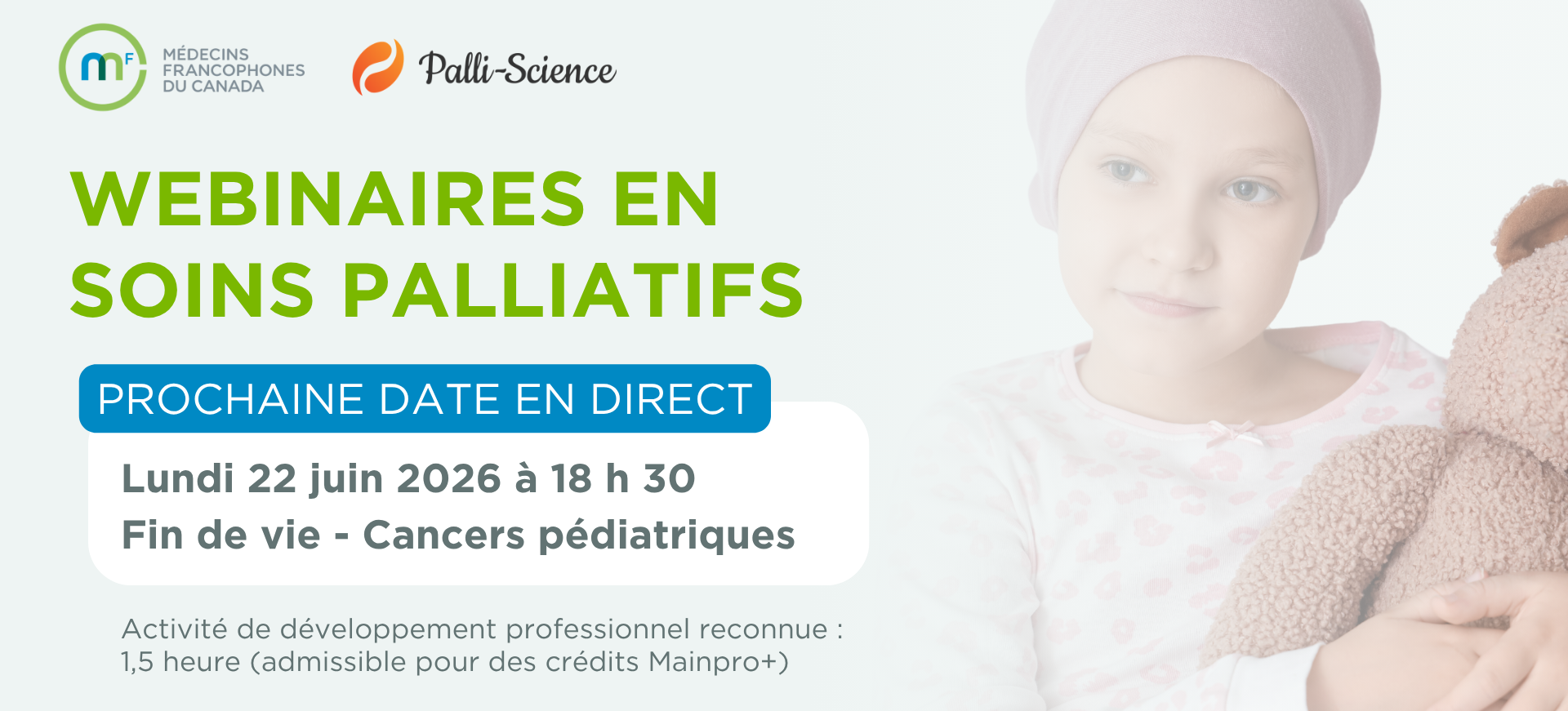 Le prochain webinaire Fin de vie : Cancers pédiatrique sera proposé le 22 juin à 18:30.
