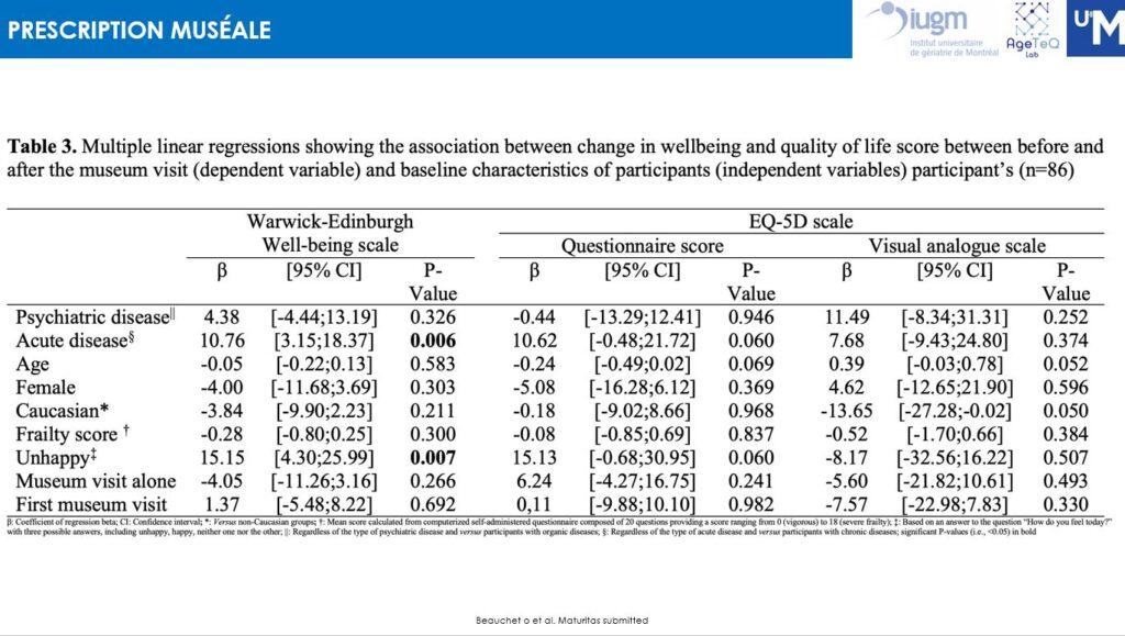 Compte tenu des effets bénéfiques démontrés de l’art sur la santé, les médecins gagneraient-ils à prescrire une visite au musée à leurs patients ? Une étude menée par l’équipe du docteur Beauchet, en collaboration avec Médecins francophones du Canada, a permis d’examiner les effets sur le bien-être et la qualité de vie d’une visite unique au MBAM, lorsque celle-ci était prescrite par un médecin dans le cadre de soins primaires et secondaires, chez des personnes vivant à Montréal. Au total, 86 patients âgés en moyenne de 51,5 ans ont participé à cette étude expérimentale non randomisée de type pré/post-intervention avec collecte prospective de données. Avant et après leur visite au MBAM, les participants ont rempli un auto-questionnaire en ligne qui incluait l’échelle de Warwick-Edinburgh (WEMWBS) et l’EuroQol-5D (EQ-5D), mesurant respectivement le bien-être mental et la qualité de vie.