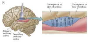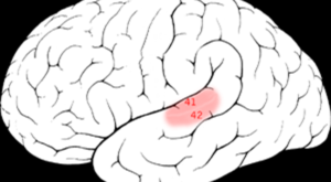 Ce sont les zones colorées ici en rouge (image), les aires de Brodmann, qui représentent notre cortex auditif primaire : la zone qui nous permet d’associer image et sons. Ensuite, c’est le cortex auditif secondaire qui nous permet de reconstruire la musique et le lobe frontal qui se charge de l’harmonie et du timbre. Ces zones du cerveau sont liées au système limbique, siège de la mémoire et des émotions. C’est pourquoi la musique peut provoquer des frissons musicaux.