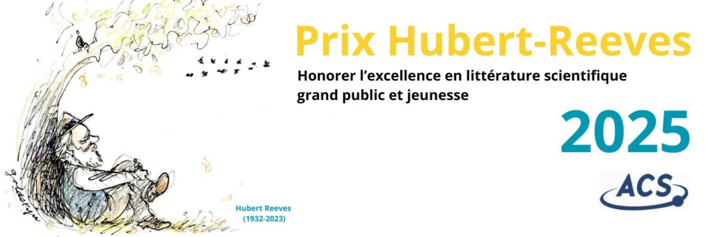 Le prix Hubert-Reeves est un concours littéraire unique qui récompense les meilleurs ouvrages francophones de vulgarisation scientifique. Il vise à stimuler la production de livres de vulgarisation scientifique en français et à promouvoir une culture scientifique de qualité au Québec et au Canada. Le prix Hubert-Reeves catégorie Grand public a été créé par l’ACS en 2011 avec la complicité de l’astronome Hubert Reeves lui-même et de sa famille. Le volet Jeunesse s’est ajouté en 2014. Depuis 2016, l’organisation du prix bénéficie d’un fonds créé par Hubert Reeves à la Fondation du Grand Montréal.