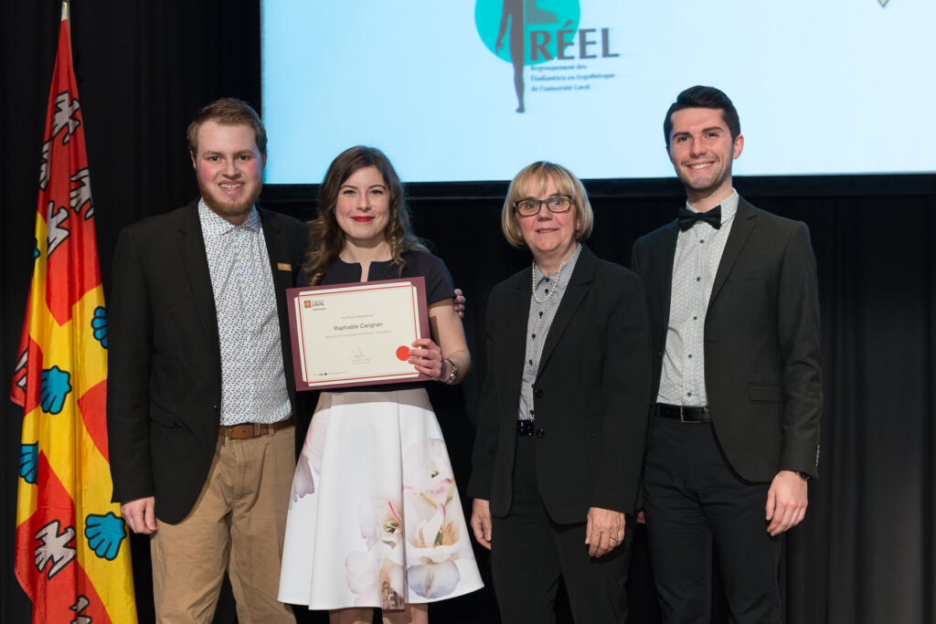 M. Julien Chiasson, président du RÉMUL, la gagnante Mme Raphaëlle Carignan, la docteure Francine Borduas et le vice-président aux affaires internes, M. Gabriel Dubois.