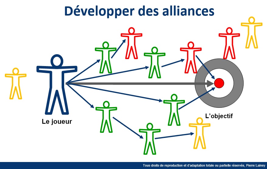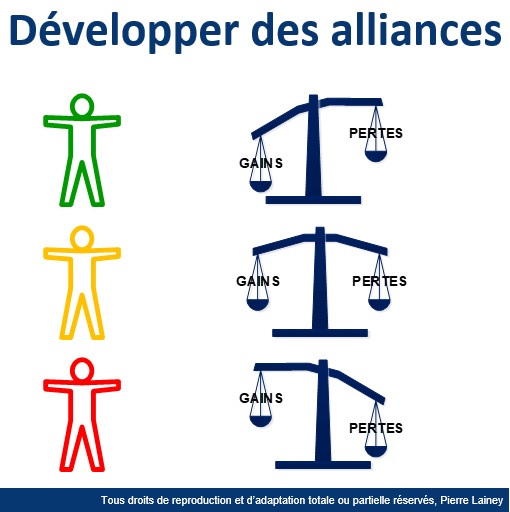 Pour créer des alliances, vous devez créer des interactions avec les personnes dont les enjeux sont compatibles avec les vôtres et chercher à les influencer afin de travailler dans une direction commune, valorisant la collaboration et l’interdisciplinarité. « Mais n’oubliez pas : vous conserverez vos alliés seulement si vous êtes disposés à la réciprocité! Si vos alliés contribuent à vous aider à réaliser vos objectifs, vous devriez également les aider à réaliser les leurs. La réciprocité permet de conserver nos alliances », insiste Pierre Lainey. Les alliés peuvent également vous aider à mobiliser vos opposants, alors qu’ils pourraient posséder une influence sur eux dont vous-même ne jouissez pas.